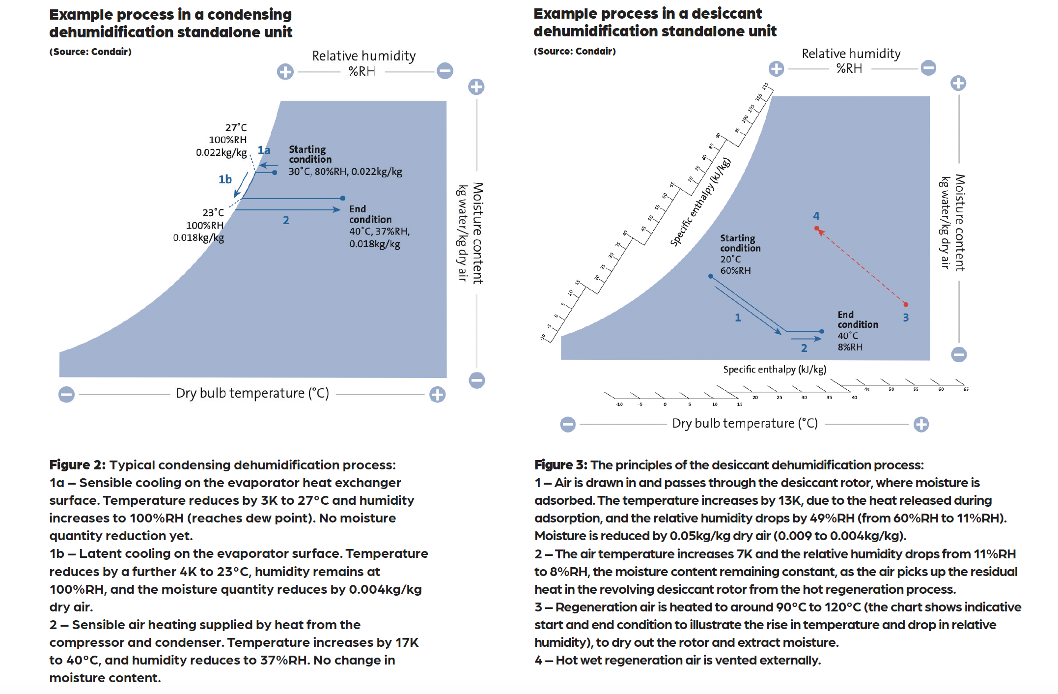 - Condensing dehumidifiers, which remove moisture by cooling air below its dew point and condensing water vapour (process D in Figure 1)