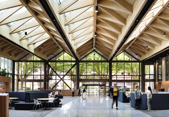 As part of the retrofit, the façade’s heavy concrete spandrels were replaced by an airtight, lightweight curtain wall that reduced services demand. A new, naturally ventilated atrium, accessible to the public, was created, and feature stairs were punched through the walls to improve the campus’s connectivity.