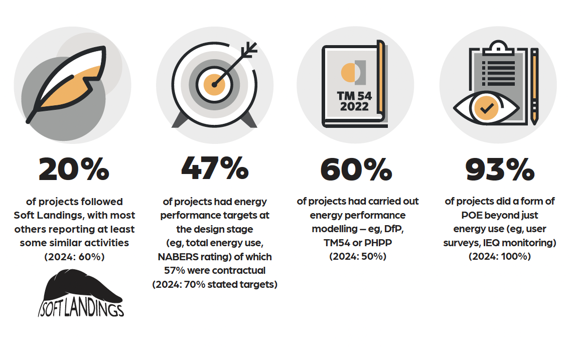 The majority of projects used energy performance modelling, rather than just compliance modelling. For example, CIBSE TM54, Passivhaus Planning Package (PHPP) or the Design for Performance (DfP) framework, which is used for NABERS UK. Many also set energy performance targets – rather than regulatory ones – such as EUIs, NABERS UK ratings and Passivhaus/Enerphit targets. Some of these were contractual targets.