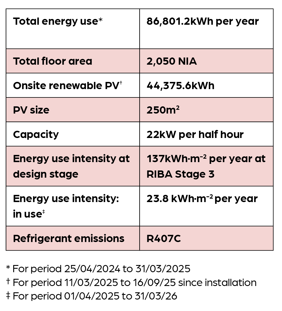 The addition, post-completion, of 268m2 of photovoltaics on the building’s roof  has resulted in an energy use intensity of 23.8kWh·m-2 per year between April 2025 and March 2026.