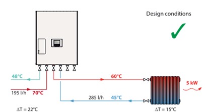 This example shows that an incorrect balancing creating a flow rate more than twice the design value, e.g. 600 l/h, the HIU would react by reducing the flow temperature to about 54 °C (from the initial 60 °C), restoring the return temperature within the limits (see drawings at the side).